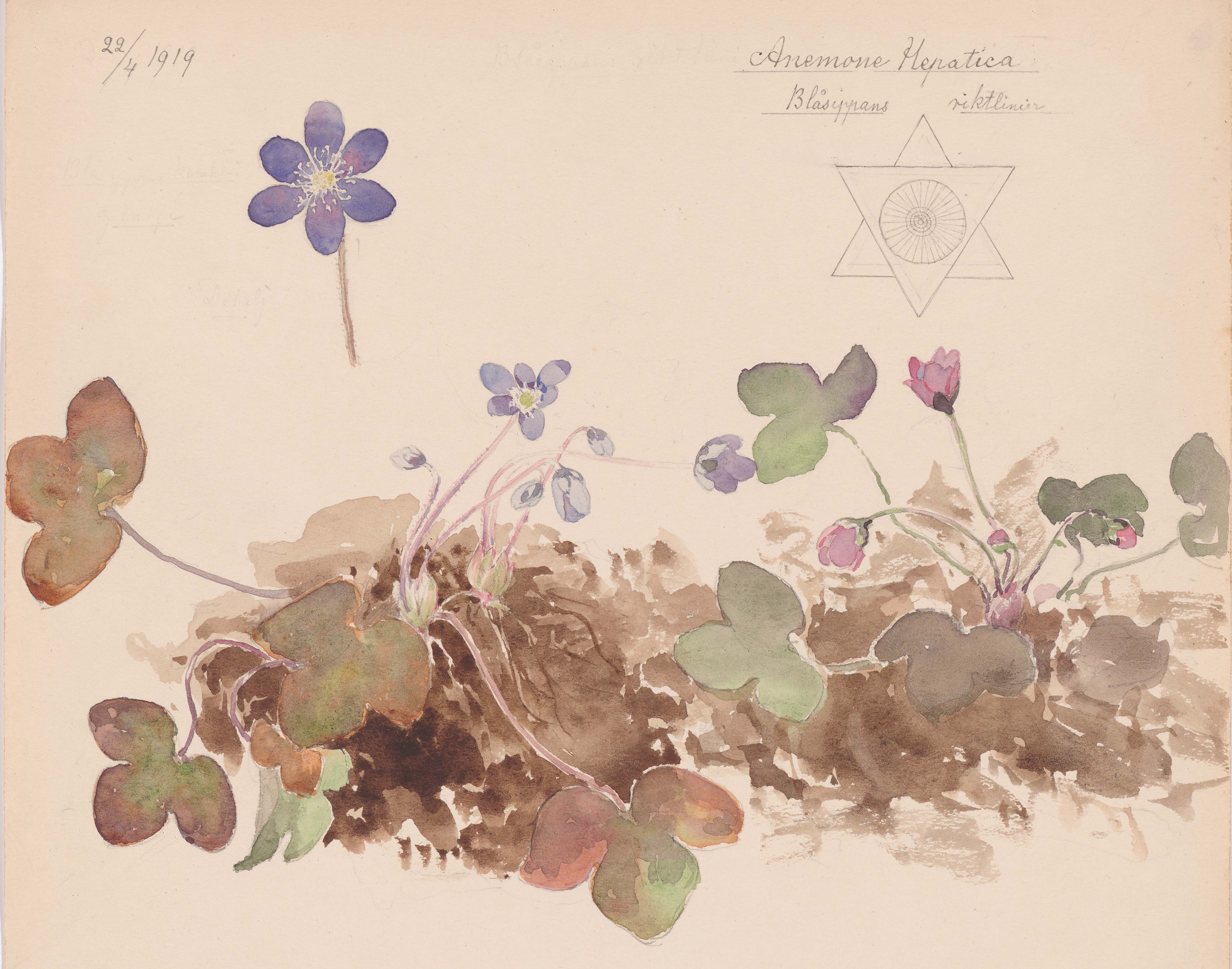 Breaking with traditional botanical art, af Klint juxtaposed her exquisitely rendered blossoms with precisely drawn diagrams: a blooming sunflower is echoed by nested circles; a marsh marigold is accompanied by mirrored spirals; a cluster of budding branches is set against checkerboards of dots and strokes. With this profusion of forms—an expansion of the abstract language for which she is best known—af Klint visualizes “what stands behind the flowers,” demonstrating her belief that careful observation of her surroundings reveals ineffable aspects of the human condition.